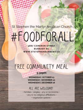 I’m so excited. Our church is offering a free meal to our community once a month. It’s an opportunity for our neighbours to eat together and get to know one another. St.Stephen the Martyr is in the Lougheed Mall area of North Burnaby. Everywhere you look there are cranes and new buildings being built. The population is expected to increase by 20,000 people in the next few years. That’s 20,000 new neighbours, and I’m hoping to meet some of them.